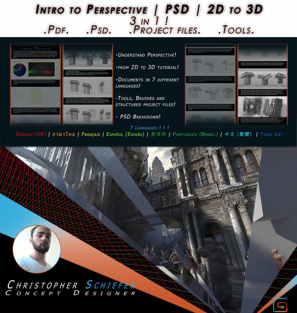 2D to 3D Construction Tutorial. Perspective Knowledge and PSD Breakdown of my Large Painting.Comes with 7 Languages, PDFs, PSDs, JPGS, brushes and tools used in this compendium.